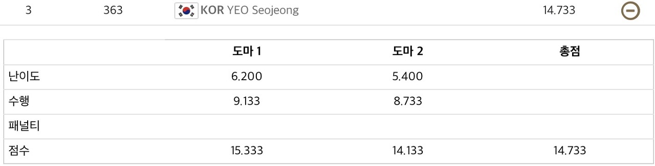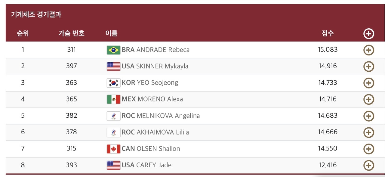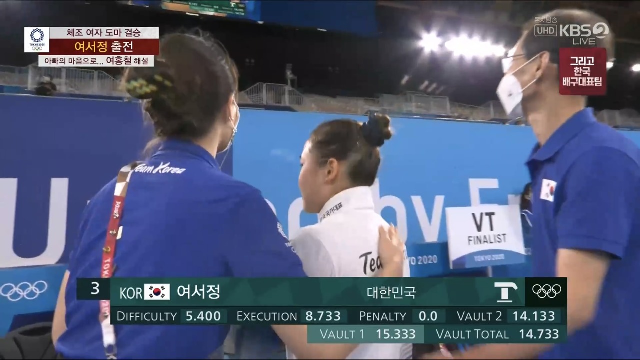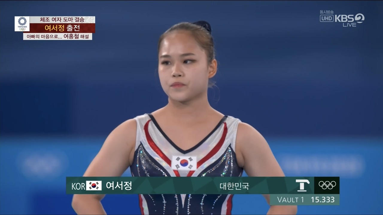첫 번째로 '여서정' 기술을 펼친 여서정은 완벽한 착지와 함께 15.333점을 받았습니다. 결선에 오른 8명의 16번의 연기 중 최고점이었습니다. 여서정 선수 본인도 만족했는지 착지와 함께 환한 미소를 보였습니다!!