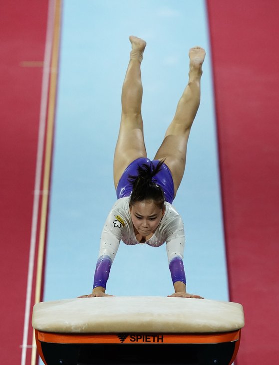 2차시기에서는 난이도 5.4점의 '유르첸코 더블 트위스트'. 힘차게 날아오른 여서정은 착지 과정에서 완벽하게 버티지 못하고 살짝 움직였습니다. 착지만 완벽했다면 금메달도 노려볼 수 있는 상황이었지만 결국 14.133점을 받으면서 동메달을 획득했습니다.