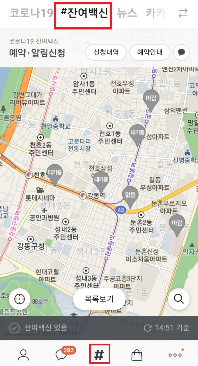 카카오톡에 [#] 영역에 들어가시면 상단에 #잔여백신 탭이 나옵니다. 해당 탭에 들어가게 되면 집 주변에 잔여백신이 가능한 곳이 지도로 나옵니다. 왼쪽 하단에 보면 잔여백신 있음 표시를 체크하실 수 있습니다. 체크 후에 보게 되면 잔여백신이 있는 곳만 나오게 되니 이것도 잔여백신 예약 팁 입니다.
