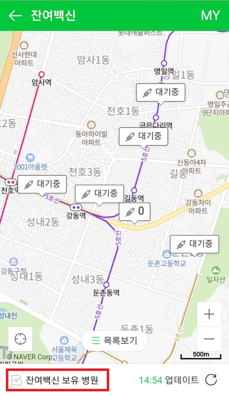 3. 잔여백신 지도를 수시로 확인하고 지도 하단에 있는 '잔여 백신 있음' 을 체크하고 예약 가능한 기관들로만 추려서 보시면 됩니다.