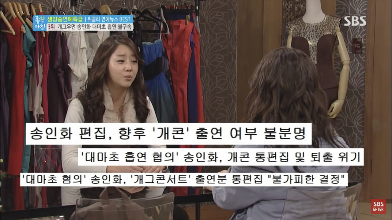 2년간 방송 활동을 중단한 송인화는 지난 2015년 tvN SNL 코리아6 출연 이후 별다른 연예 활동을 하지 않고 있습니다.
