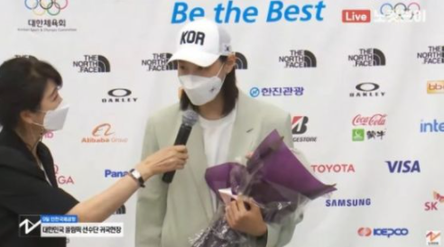 여기까지는 그렇다 쳐도, 인터뷰가 마무리될 즈음이 되어서 갑자기 대통령이 여자 배구팀을 격려해준 것에 대해 답변을 여러 차례 요구하며 논란이 되었습니다.