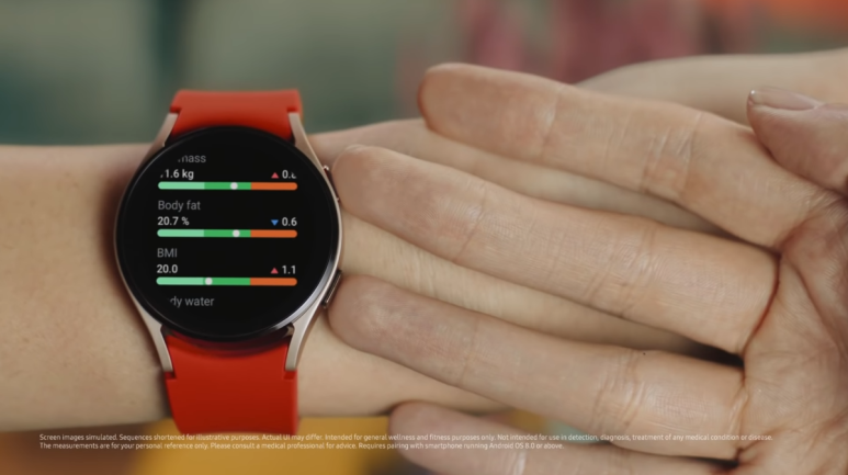 갤럭시 워치4는 체성분 측정 기능도 지원합니다. 갤럭시 워치4 스마트워치에 두 손가락을 대는 것만으로  골격근량, 기초대사량, 체수분 및 체지방률 등을 15초 만에 확인할 수 있다니 놀랍지요?